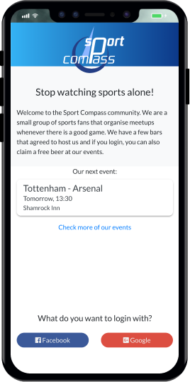 Easily log in through Facebook or Google and see all the upcoming games and events.